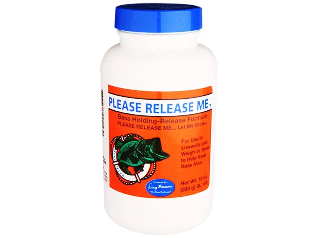 Sure-Life Please Release Me is a livewell additive that helps keep bass alive. Please Release Me dissolves readily to calm bass, helps replace protective slime coats, heals hook wounds, reduces weight loss, and removes chlorine. One teaspoon of Please Release Me treats 10 gallons of water, reducing lost points due to dead fish.